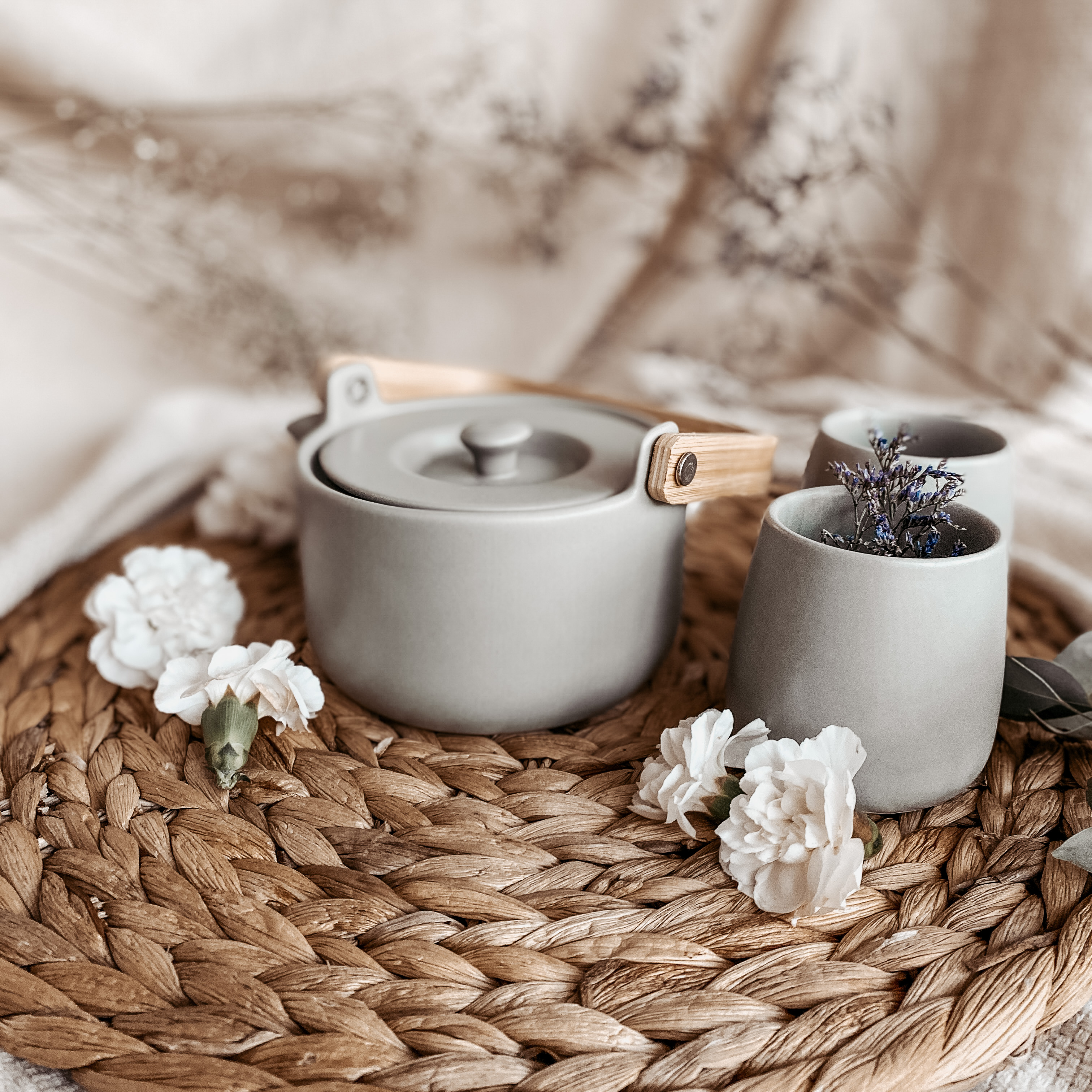 Ceramiczny dzbanek o pojemności 500 ml w zestawie z dwoma kubeczkami (bez uchwytów) 200 ml każdy w przepięknym kolorze zgaszonej mięty.