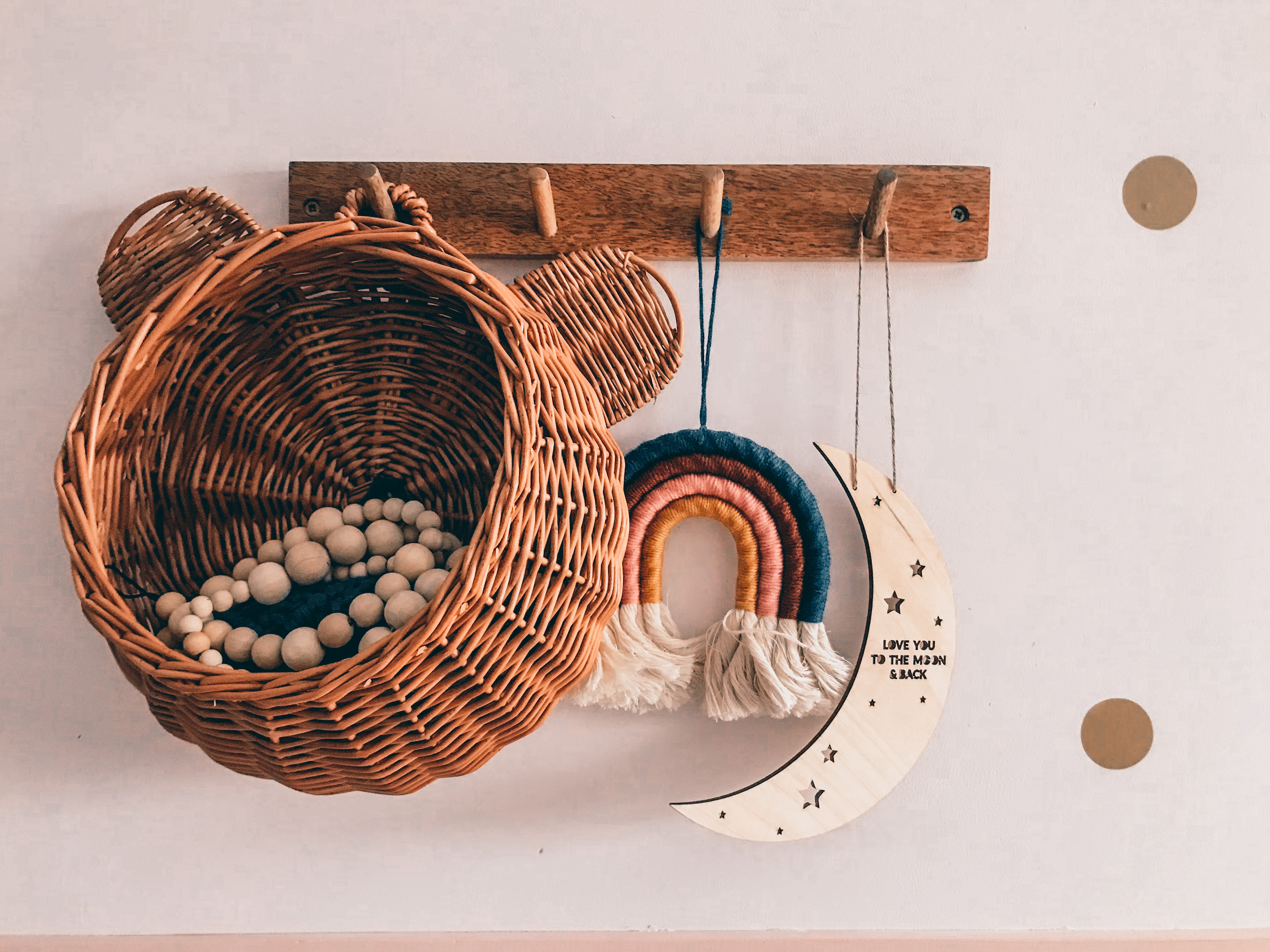 Można go zawiesić nad łóżeczkiem lub komodą. Pięknie komponuje się z innymi drewnianymi dodatkami.
