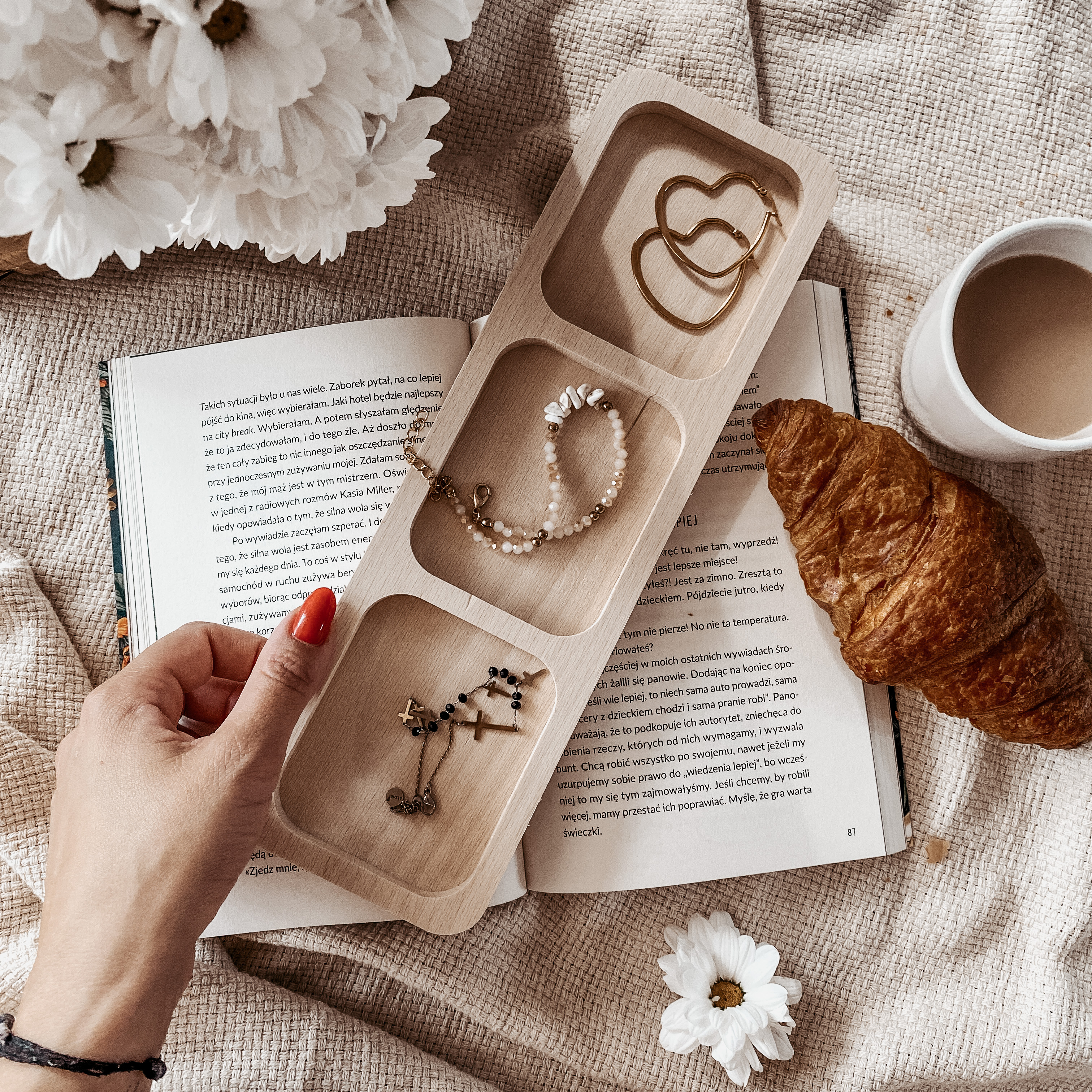 Prostokątna, drewniana taca z trzema przegródkami to klimatyczny dodatek, w którym przechowywać możesz orzechy, suszone owoce czy słodkości lub na biżuterię.