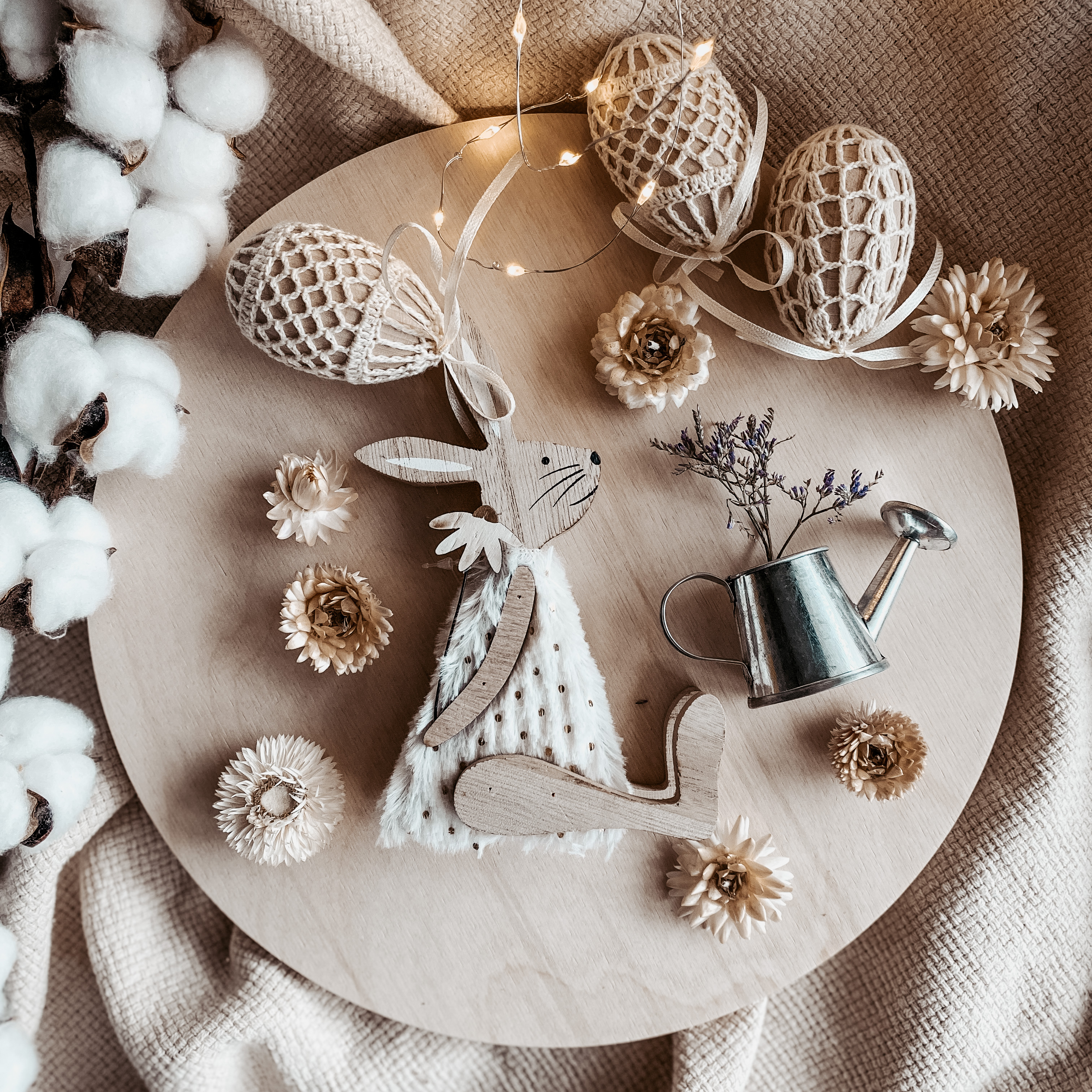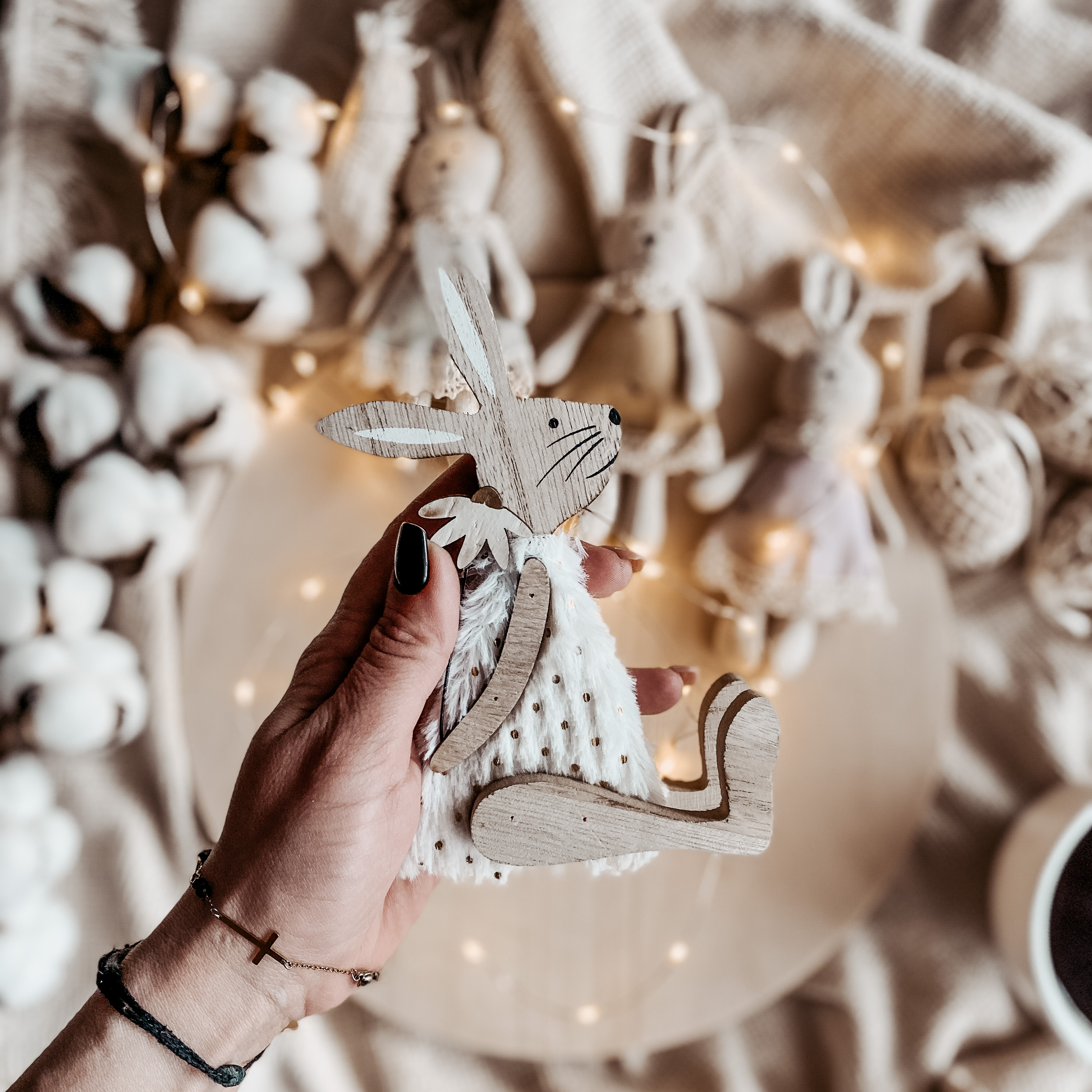 Drewniany zajączek w białym futerku.
