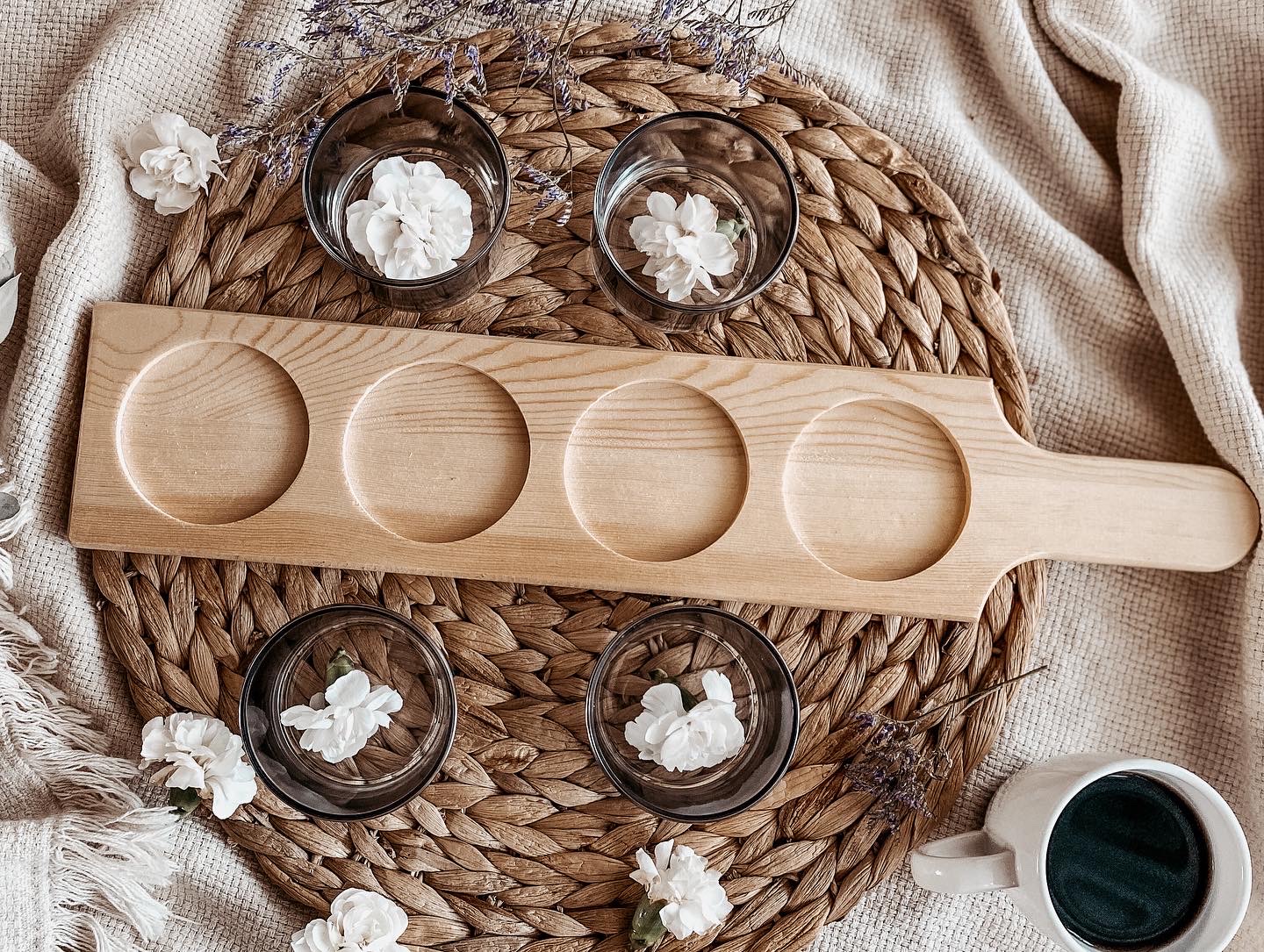 Zestaw składa się z 5 elementów - drewnianej deski oraz 4 szklanych pojemników , w których możesz serwować zarówno przekąski, dipy, sosy, ale również sałatki czy desery.
